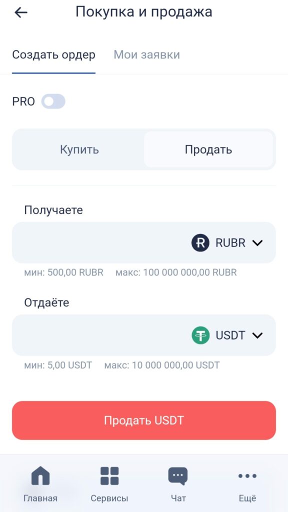 После зачисления криптовалюты на платформу необходимо конвертировать USDT в RUBR — внутренний фиатный инструмент, привязанный к курсу рубля 1:1. Обмен производится через торговый стакан в разделе «Покупка и продажа» с помощью рыночного или лимитного ордера.